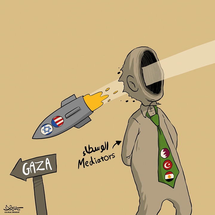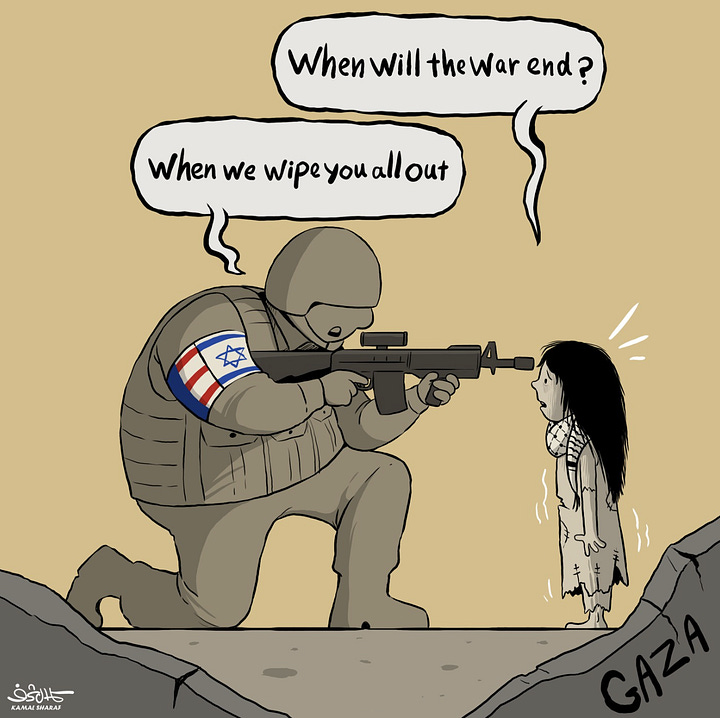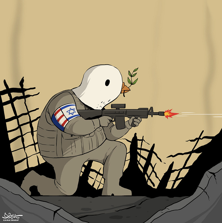 I want to introduce you to a Palestinian artist, an illustrator I’ve been following for two years. His work has been piercing my heart ever since I discovered it. I even included one of his illustrations in one of my most-read features, written after that performative glorious ceasefire in January 2024 — the one that never truly ceased any fire, but instead paved the way for the most gruesome, livestreamed massacre the world has ever witnessed.