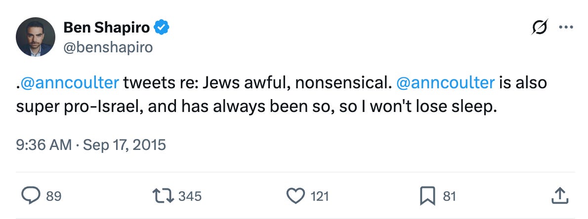 Read it again. He’s talking about Ann Coulter talking shit about Jews, but she’s pro-Israel, so he doesn’t mind. He won’t lose sleep.